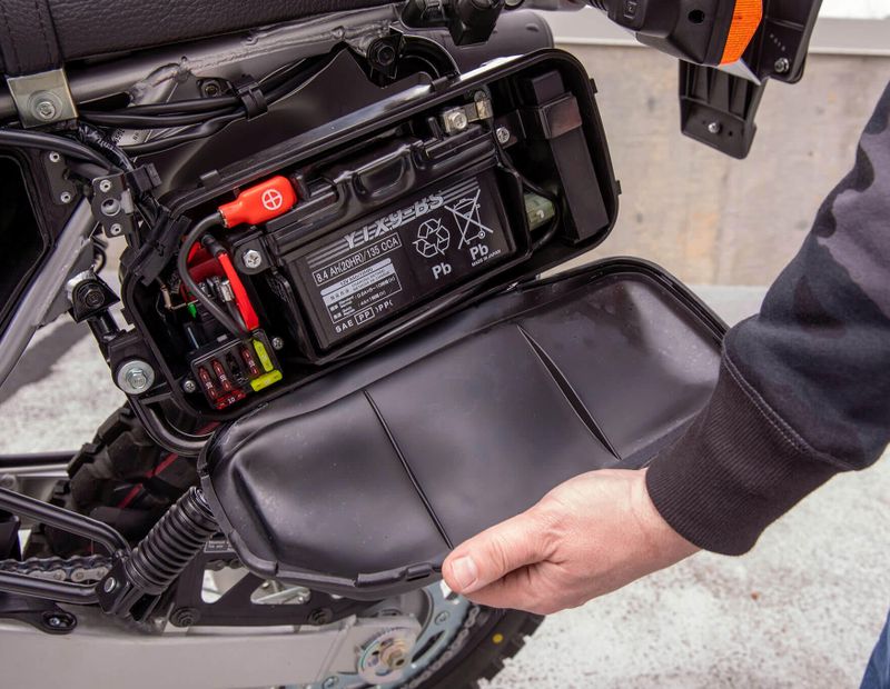 Accessing the air filter, battery, and fuse box is fast and easy, thanks to the quick-release fasteners on the left sidecover.