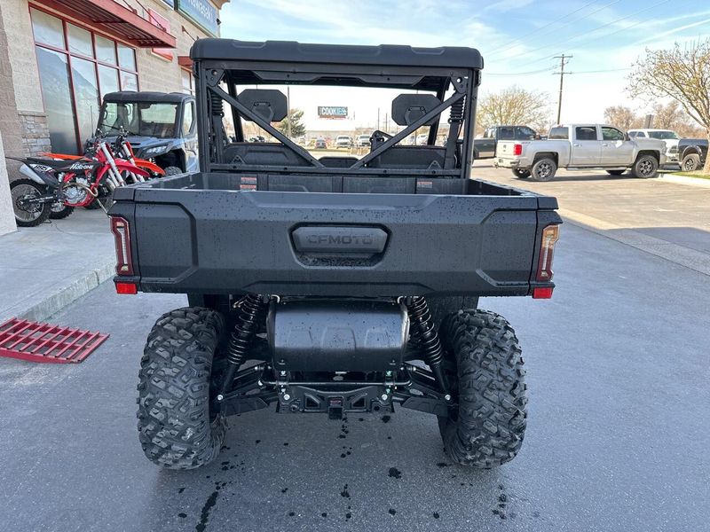 • ADDITIONAL FEATURES: Electronic power steering, Bosch® electronic throttle with work/normal modes, 4500 lb. winch with synthetic rope, 3-person bench seats, side nets, CFMOTO LED™ headlights/taillights with backup lights, tilt steering wheel, CFMOTO RideSync app compatible (T-Box), 12V outlet, USB port, push button shifting, nfc key, 8” CFMOTO RideSync™ touch screen display, electronic / hydraulic tilt bed, skid plate, front & rear sway bars, Hill Descent Control, locking rear differential, side rear view mirrors, roof, bus bar, 2” receiver, adjustable driver's and passenger's seats, audio package