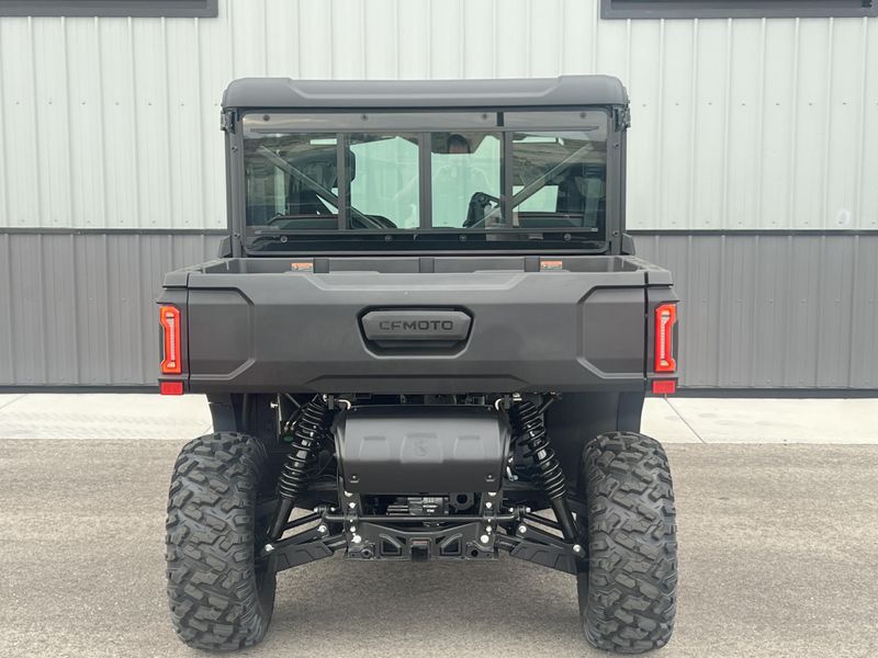 • ADDITIONAL FEATURES: Electronic power steering, Bosch® EFI, electronic throttle with work/normal modes, OmniDrive™ CVT, 4500 lb. winch with synthetic rope, two 3-person bench seats, CFMOTO LED™ headlights/taillights with backup lights, tilt steering wheel, CFMOTO RideSync app compatible (T-Box), 12V outlet, USB port, push button shifting and starting, nfc key, 8” CFMOTO RideSync™ touchscreen display, electronic / hydraulic tilt bed, skid plate, front & rear sway bars, Hill Descent Control, locking front and rear differential, side rear view mirrors, roof with headliner, bus bar, 2” receiver, adjustable driver seat, audio package, power glass tip out windshield with wiper, sliding rear glass window, full locking doors with power glass windows, factory installed HVAC, 150amp charging system